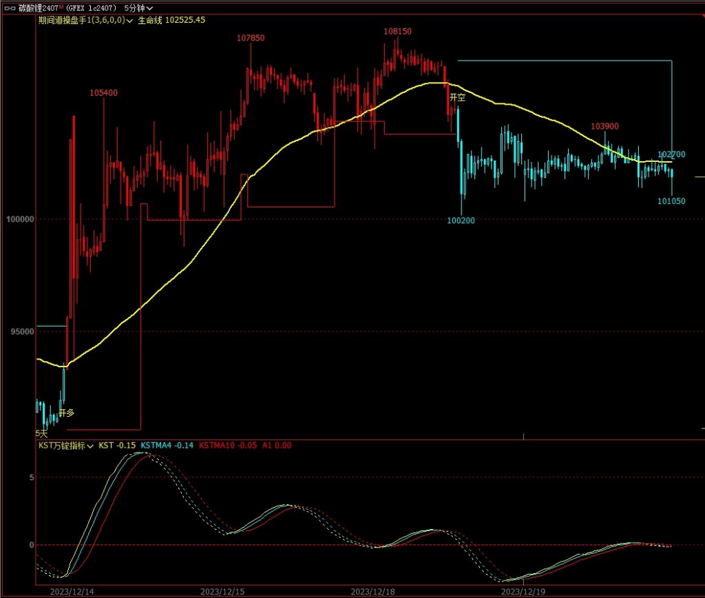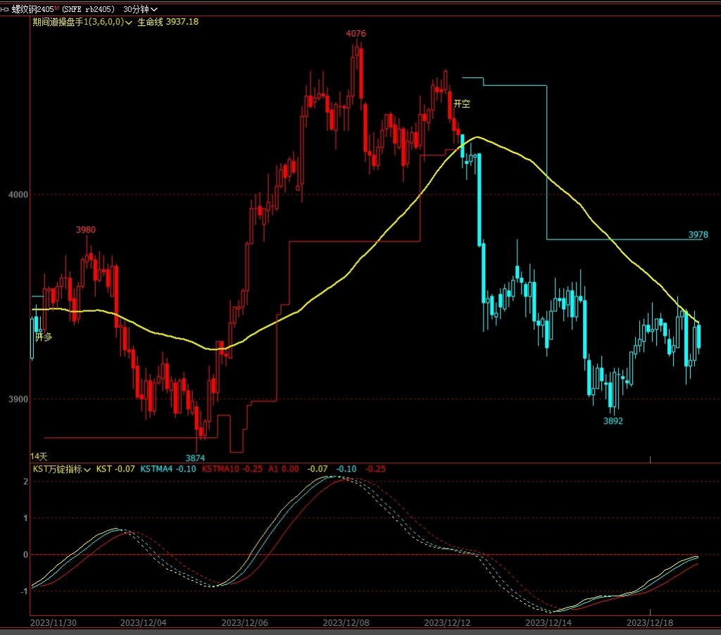 下面展示的效果图主图是艾云策略的期间道,副图是万锭指标(KST)指标: