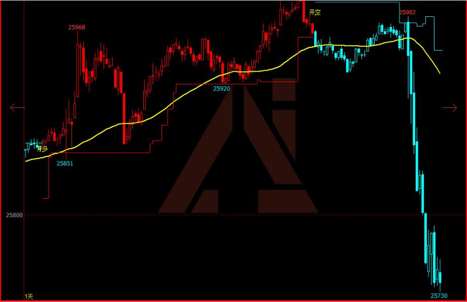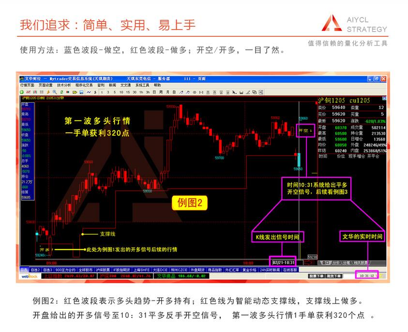 开盘给出的开多信号至10:31平多反手开空信号, 第一波多头行情1手单获利320个点 。
