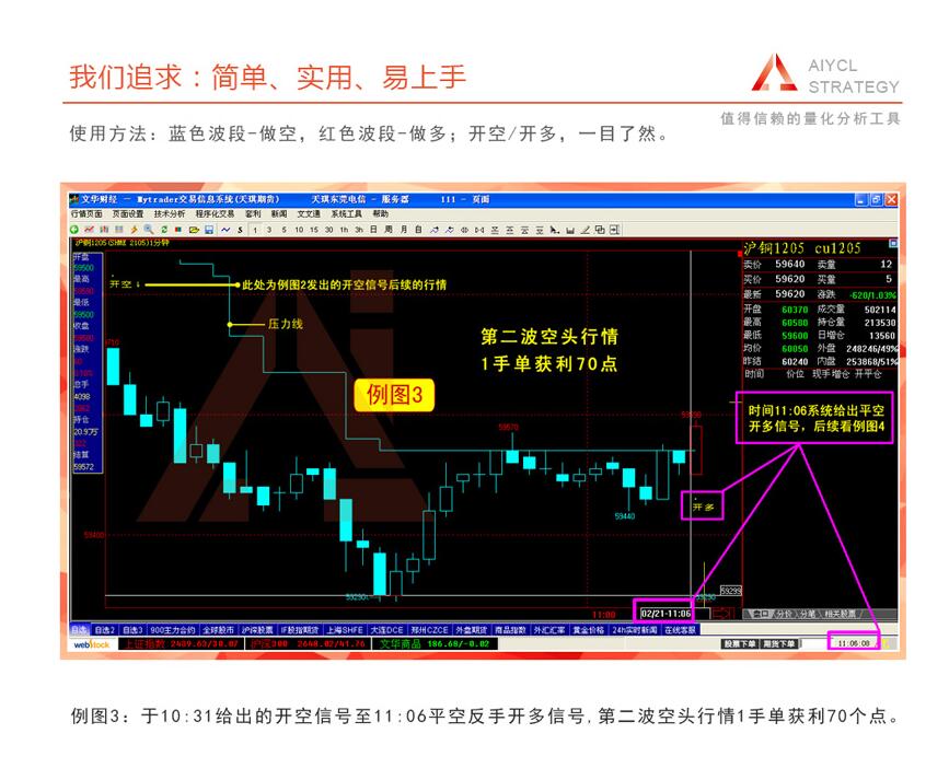 例图3:于10:31给出的开空信号至11:06平空反手开多信号, 第二波空头行情1手单获利70个点 。