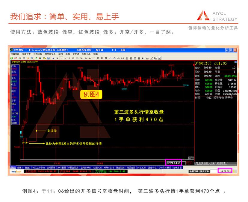 例图4:于11:06给出的开多信号至收盘时间, 第三波多头行情1手单获利470个点 。