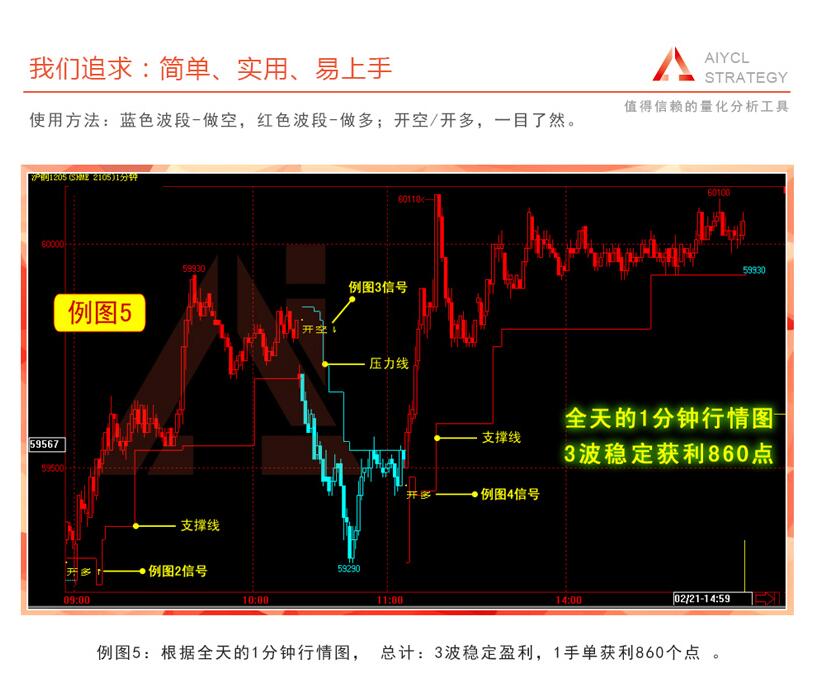例图5:根据全天的1分钟行情图, 总计:3波稳定盈利,1手单获利860个点 。