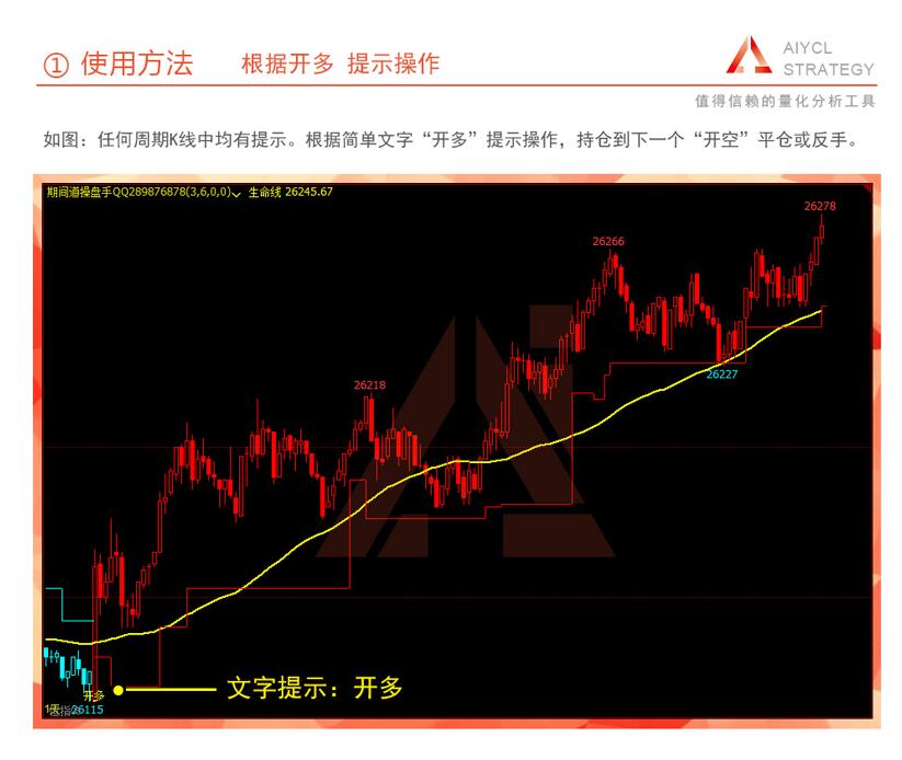 可在盘中每一波上涨前给出一个向上的小箭头和开多文字提示,意味着可以开多;