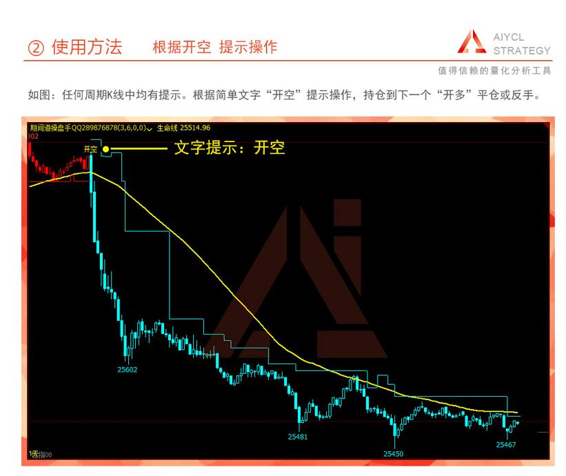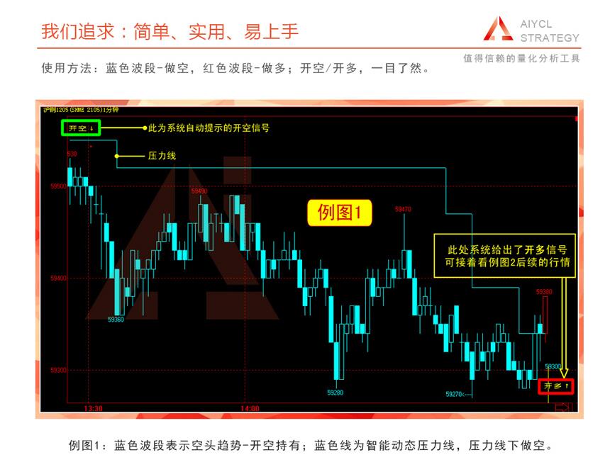 在下跌前会给出一个向下的小箭头和开空文字提示,意味着可以开空,从而把繁锁的技术分析简单直观化,