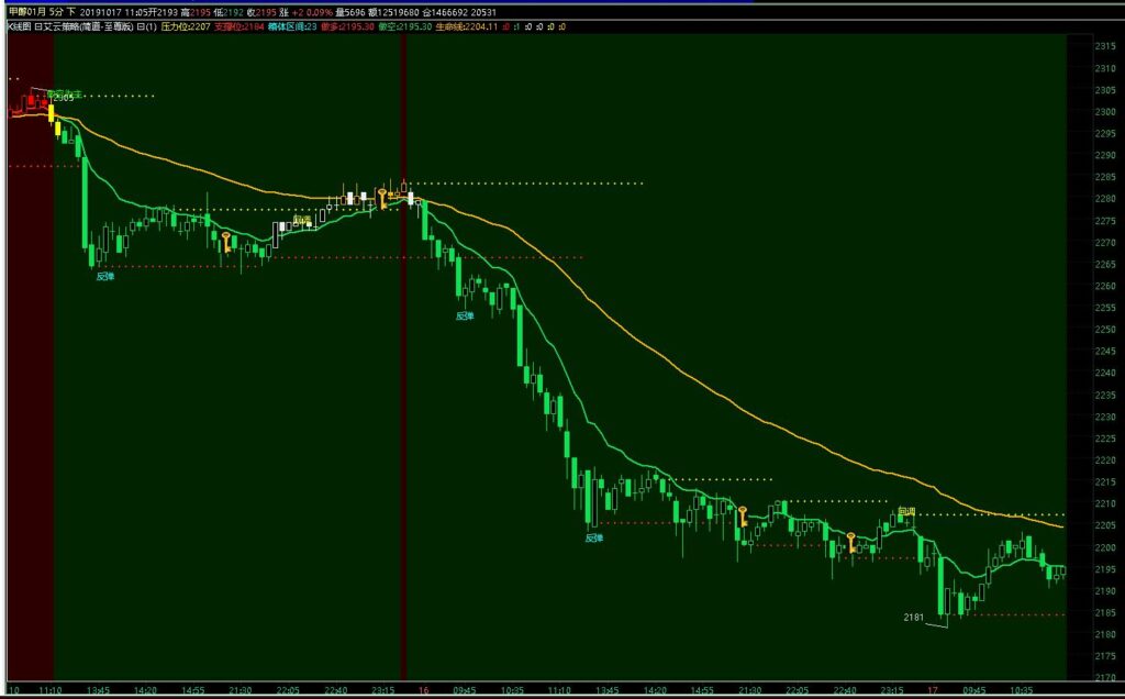 期货甲醇01合约,19年10月17号5分钟行情分析走势图