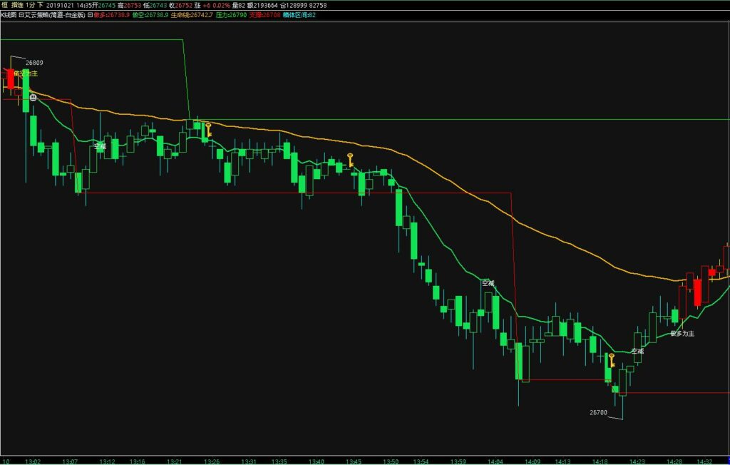 恒指期货2019年10月21号下午1分钟行情分析走势图