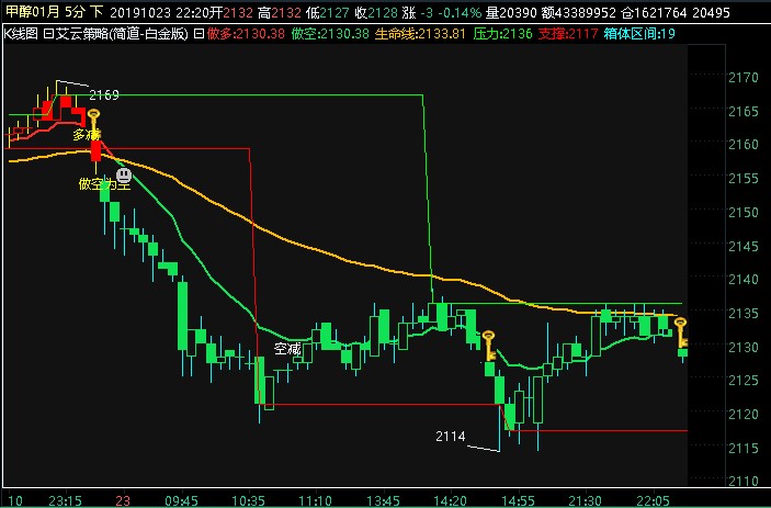 商品期货甲醇01合约,19年10月23号5分钟行情技术分析走势图