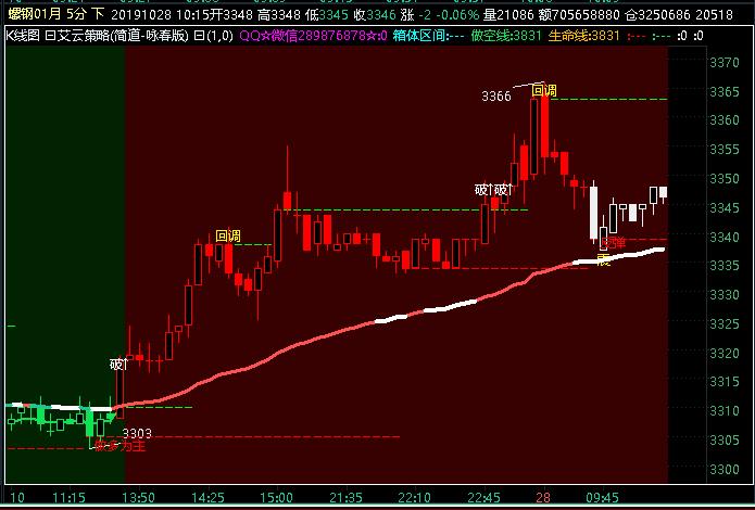 商品期货螺纹钢01合约,19年10月28号5分钟技术分析图