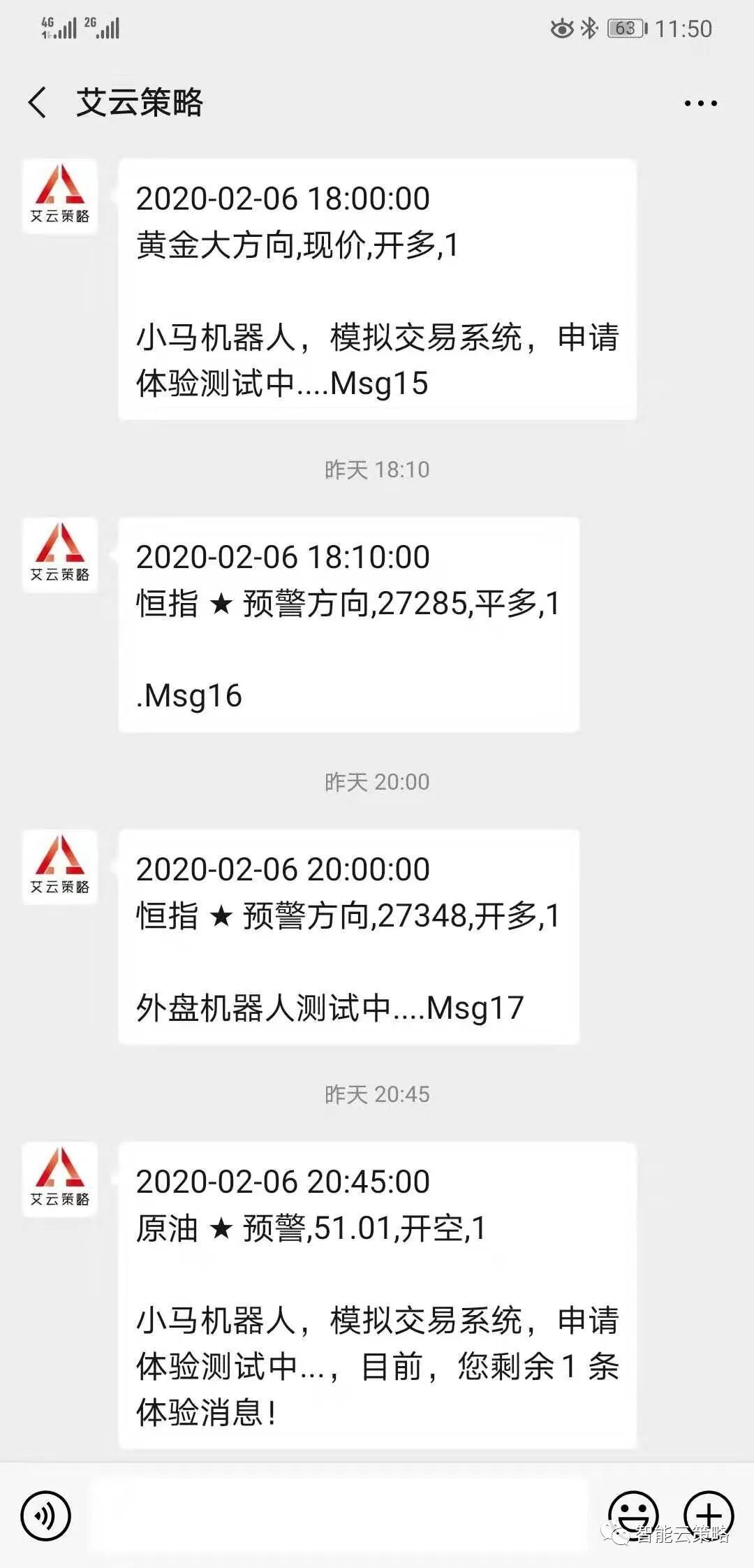 AI机器人信号体验版已经推出,后面还会陆续增加更多外汇品种,商品期货等,有需要的请提前关注艾云策略公众号,详情可咨询行者微信289876878