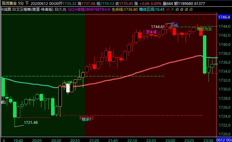 平时做日内现货黄金,我选择用30分钟来确定趋势,现货黄金从艾云策略系统中看出(提示做多,背景色为红色),从6月8号起,黄金30分钟技术分析走势图为多头趋势。