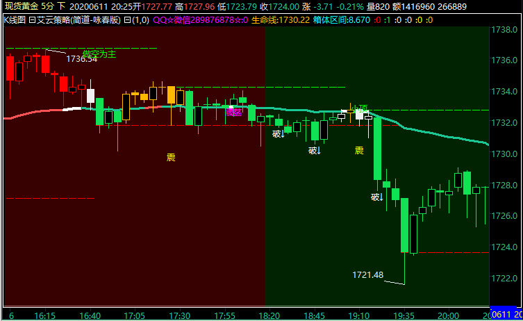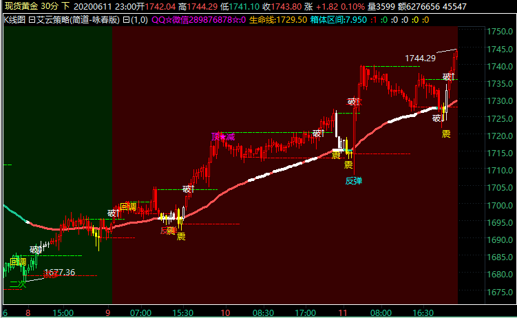 平时做日内现货黄金,我选择用30分钟来确定趋势,现货黄金从艾云策略系统中看出(提示做多,背景色为红色),从6月8号起,黄金30分钟技术分析走势图为多头趋势。