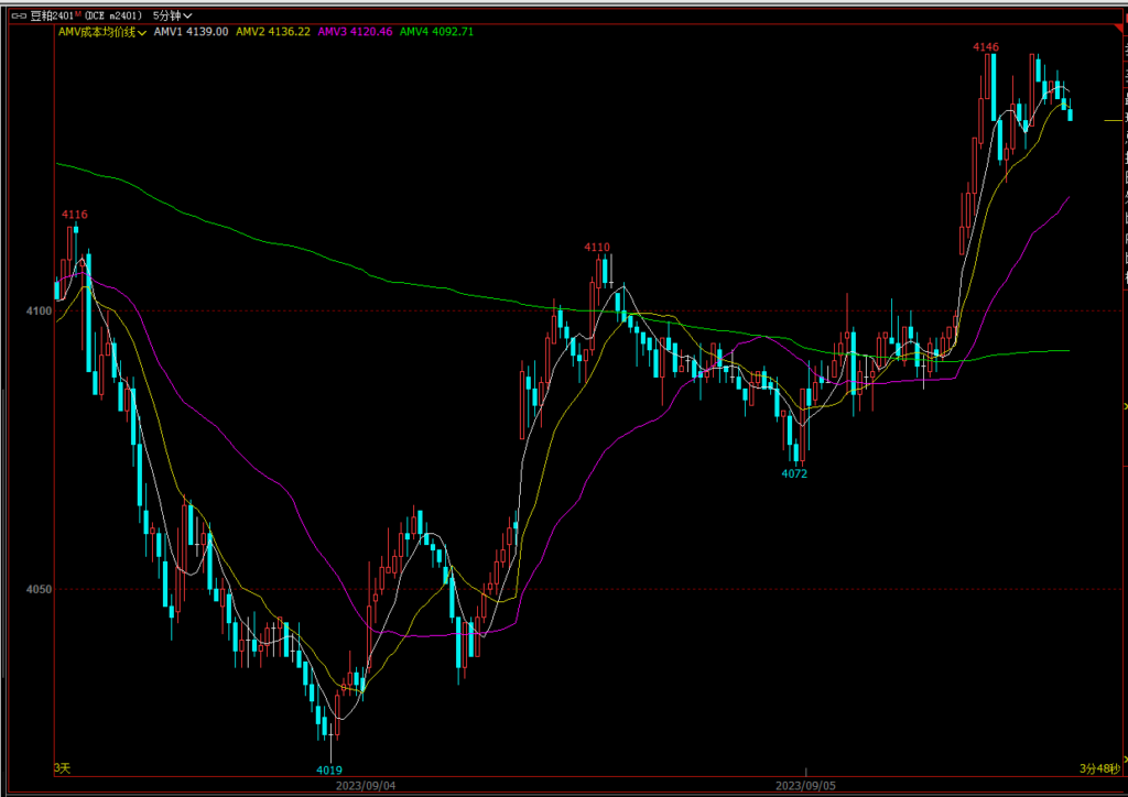 下面AMV指标源码为自身特有的均线系统(5,13,34,250)。